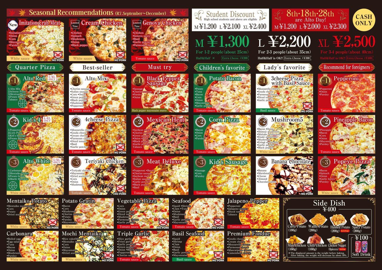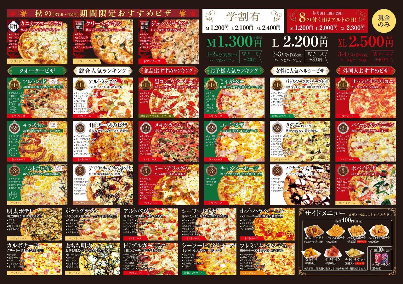 別府市のピザ屋【持ち帰り・テイクアウト専門】ピザアルト別府店は、テイクアウト専門だから、宅配ピザより安くてリーズナブル。通常サイズのM/Lに加えXLサイズでパーティーやイベントにもおすすめ!8の付く日の割引・学割・クーポンカードなどお得なサービスも多数ご用意!大分県別府市でピザなら、宅配ピザより安くておいしい、ピザアルト別府店をご利用ください。